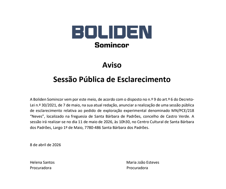 Nos termos da legislação em vigor, a Boliden Somincor irá promover, no próximo dia 11 de maio de 2026, pelas 10h30, no Centro Cultural de Santa Bárbara de Padrões, uma sessão pública de esclarecimento relativa ao pedido de exploração experimental designado MN/PCE/128 “Neves”, localizado num território que abrange também a Freguesia de Santa Bárbara de Padrões.